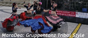 Die Gruppe MaraDea, Info unter -> KLICK <-, folgte mit verschiedenen Tänzen aus der Richtung "Tribal Style Danc". Tribal Style ist ein moderner Gruppentanz, der auf Elementen orientalischer, asiatischer und nordafrikanischer Tänze basiert. Bewegungen und Schrittkombinationen unterliegen einem Reglement, das es einer beliebigen Anzahl von Frauen ermöglicht, frei und ohne Choreographie miteinander zu tanzen.