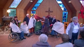 hr gab es zur Weihnachtsfeier etwas Besonderes: In der für solche Anlässe schönen Kapelle auf dem Gelände des Annastiftes wurde die Weihnachtsgeschichte von den teilnehmenden Personen - ohne vorherige Probe - nachgespielt. Auf die Idee kam Bernd Künz. Mit geholfen hat Maria Th. Garbs. Die Requisiten für die Handlung stellte Bernd Künz. Alle Personen, die mitmachten, waren mit Begeisterung dabei.